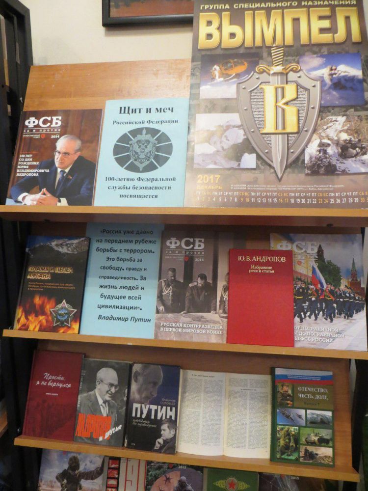 В информационно-краеведческом отделе центральной городской библиотеки имени А. П. Малашенко работает выставка «Щит и меч Российской Федерации», посвящённая 100-летию Федеральной службы безопасности.