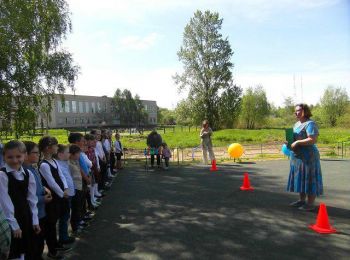 На развлекательную игровую программу, посвящённую Дню семьи, собрались ученики начальных классов средней школы № 2, к ним присоединились ребятишки, играющие на площадке. Сегодня большие мячи превращались в лягушек, и дети скакали на них к болоту, где добывали волшебную стрелу. Ребята крутили колесо знаний и открывали волшебную книгу загадок.