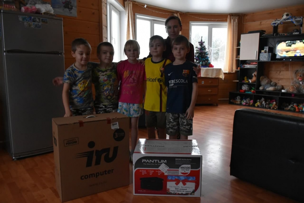 Семье Смирновых вручили компьютер и МФУ с функциями принтера, сканера и ксерокса. В семье пять школьников и это очень хорошее подспорье для организации образовательного процесса.