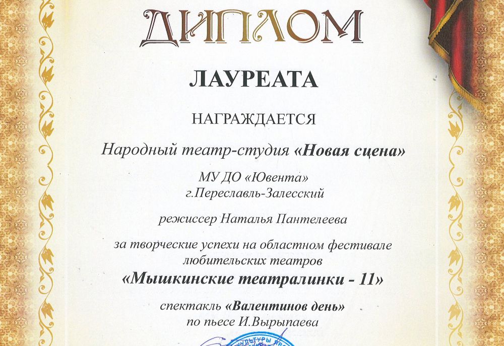 Театр-студия «Новая сцена» МУ ДО «Ювента» завоевал высшую оценку фестиваля ДИПЛОМ ЛАУРЕАТА за спектакль по пьесе И. Вырыпаева «Валентинов день». Поздравляем наших победителей и желаем дальнейших успехов на фестивалях и конкурсах!