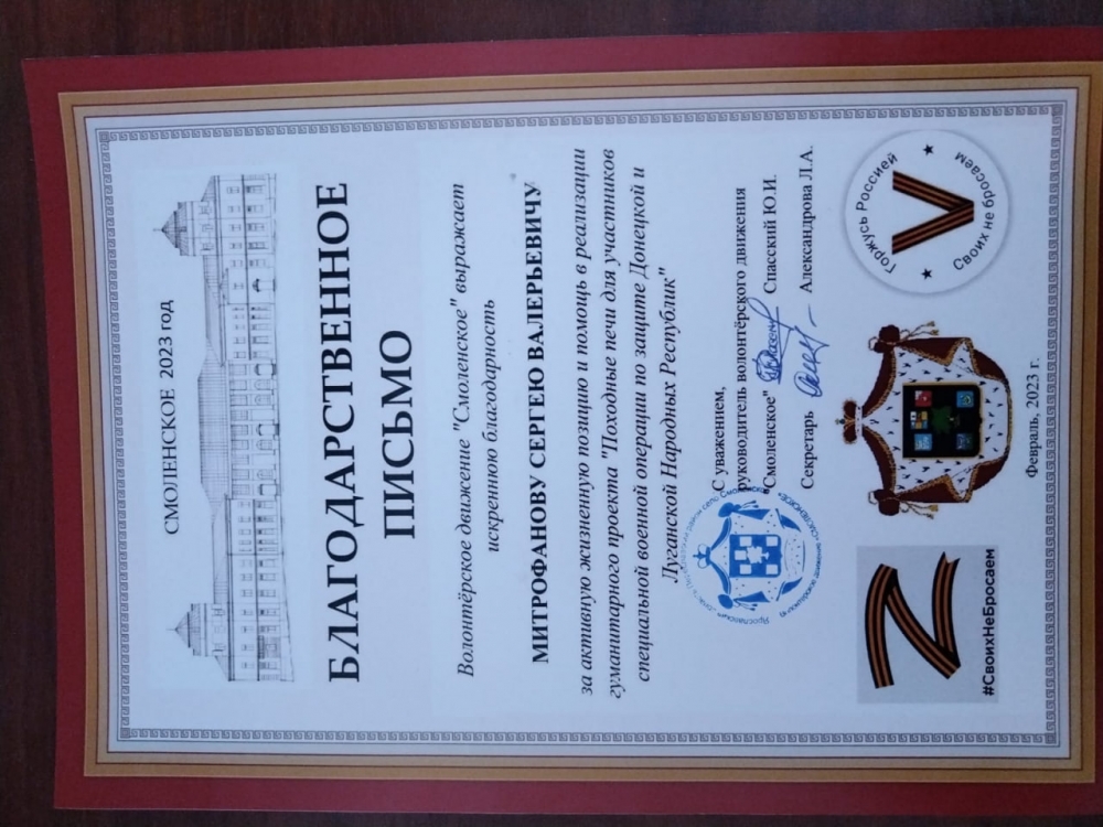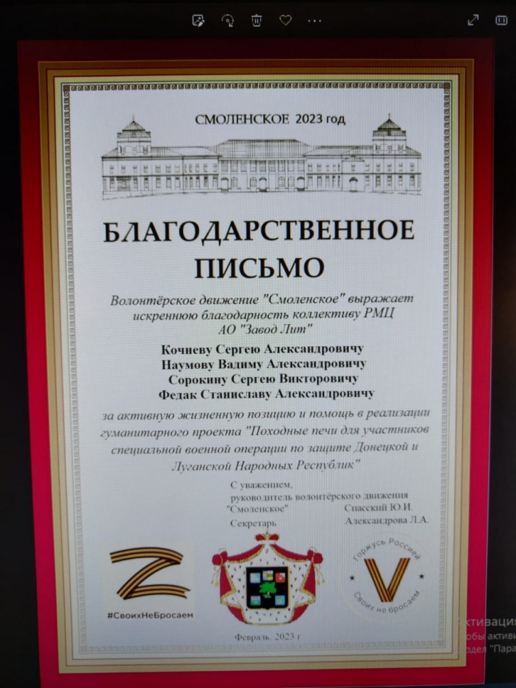 Жители села принесли свои сварочные аппараты, электроды, отрезные диски и многое другое. И работа началась в мастерской фермерского хозяйства Ивана Владимировича «Смоленское». Одни расчерчивали заготовки, другие резали, третьи варили и в итоге, за три дня, жители села произвели 85 походных печей. Из них 16 штук сделал сварщик Сергей Валерьевич Митрофанов в своём гараже в Горках. С такой помощью себестоимость печей уменьшилась, и мы сэкономленные денежные средства, а это порядка 15 тысяч рублей, волонтёры Смоленского перевели в госпиталь на лечение раненых, – завершил свой рассказ о дружном селе Юрий Спасский.