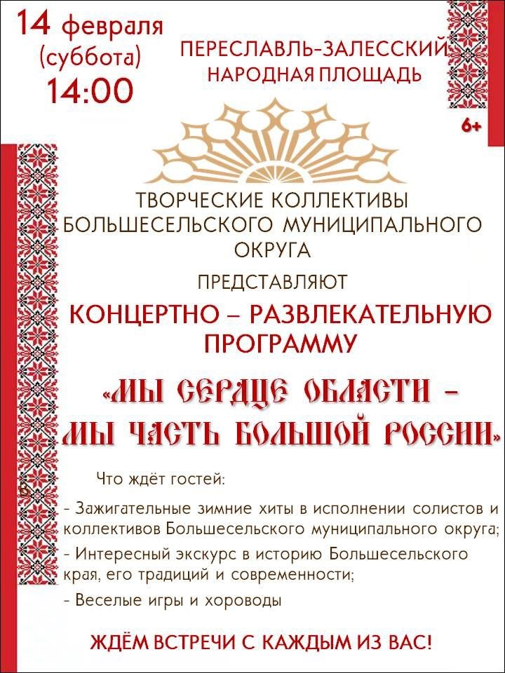 14 февраля в 14:00 на Народной площади выступят гости из Большесельского муниципального округа с интерактивно-развлекательной программой «Мы сердце области - мы часть большой Росси». Жителей и туристов ожидают зажигательные зимние хиты в исполнении солистов, интересный экскурс в историю Большесельского края и его традиций. А также веселые игры и хороводы.