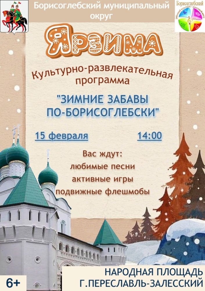15 февраля в 14:00 на Народной площади Переславль примет артистов из Борисоглебского муниципального округа с интерактивно-развлекательной программой "Зимние забавы по-борисоглебски". Жителей и туристов ожидают любимые песни, активные игры и подвижные флешмобы.