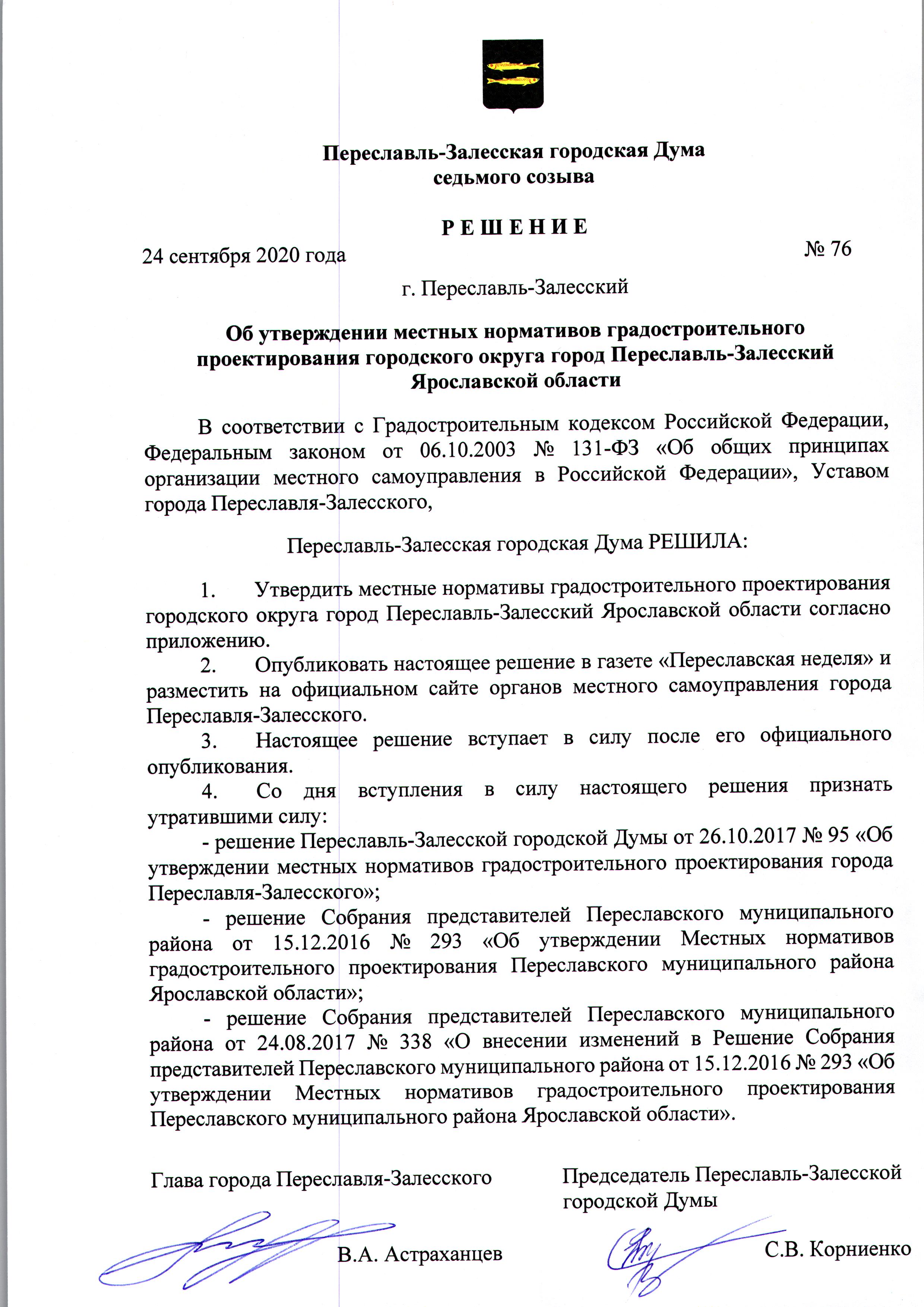 Решение № 78 от 24 сентября 2020 года "О внесении изменений в Правила землепользования и застройки города Переславля-Залесского