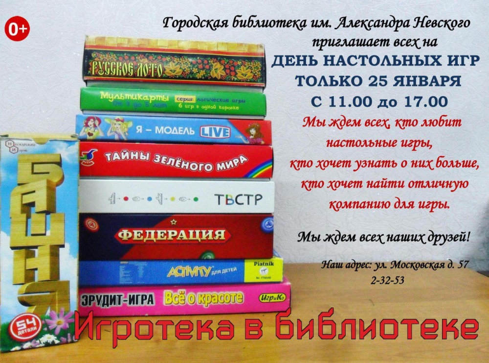 В городской библиотеке имени А. Невского собралась довольно большая коллекция настольных игр, и мы приглашаем всех на день настольных игр. А именно, в Татьянин день и День студента, 25 января, с 11 до 17.00 вы сможете окунуться в мир разнообразных настольных игр.