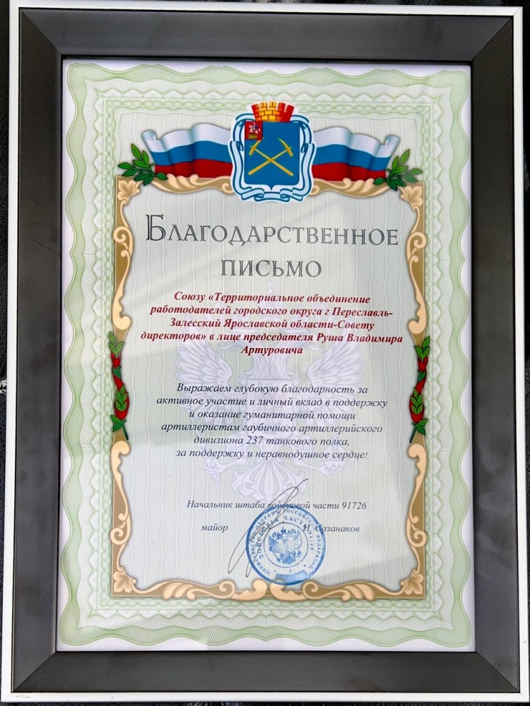 Союз «Территориальное объединение работодателей городского округа г. Переславль-Залесский Ярославской области – Совет директоров» в лице председателя Владимира Артуровича Руша удостоен высокой оценки за активное участие и личный вклад в поддержку бойцов гаубичного артиллерийского дивизиона 237 танкового полка.