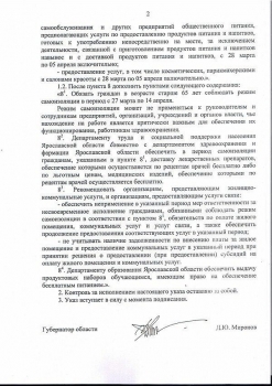 В соответствии с указом губернатора Ярославской области на период с 28 марта по 5 апреля должны быть закрыты кафе, рестораны, салоны красоты, парикмахерские, кинотеатры, клубы. Региональная сеть МФЦ будет работать с заявителями исключительно по предварительной записи. До воскресенья посещение бань будет ограничено — допустимо одновременное пребывание там не более 10 человек, сеанс – один час. О работе бани на следующей неделе будет сообщено дополнительно. Валерий Астраханцев рекомендовал воздержаться от посещения мест массового пребывания людей, ограничить походы по магазинам. Во время прогулок или походов за покупками держаться от других людей на расстоянии.