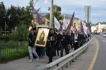 К нам в Переславль марафонцы прибыли во второй половине дня в сопровождении команды Нижегородской области и байкеров клуба «Ночные волки». Участники марафона привезли с собой святыню – образ благоверного князя Александра Невского, специально написанный для автопробега. С этим образом гости нашего города прошли малым крестным ходом до Красной площади, где их хлебом-солью встретили жители Переславля.