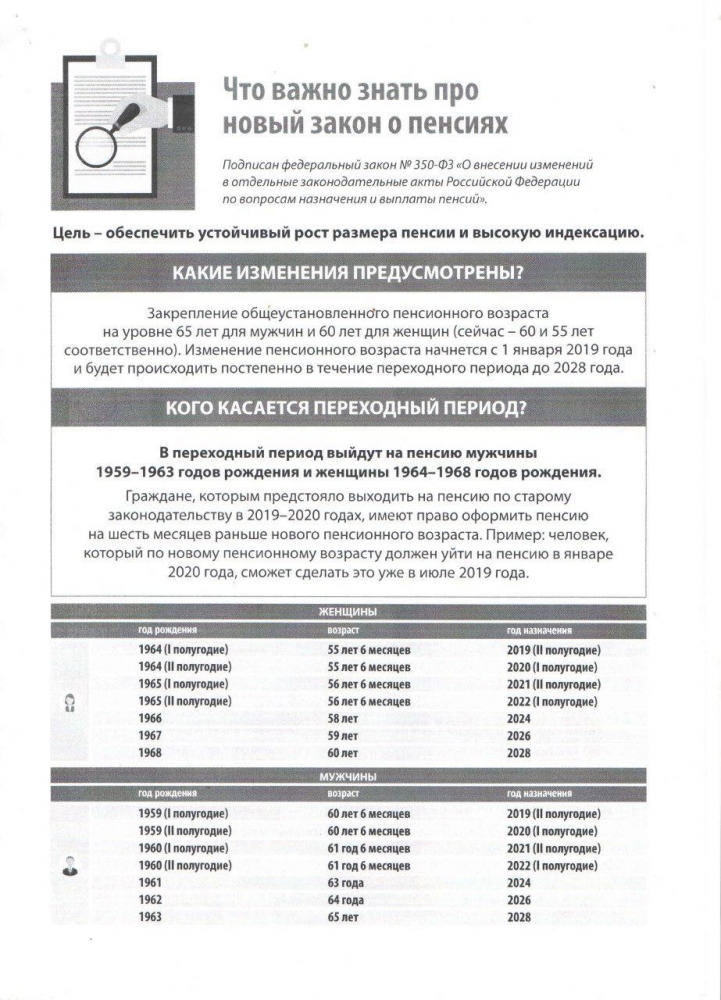 3 октября текущего года вступил в силу закон № 350-ФЗ о повышении пенсионного возраста в России, который был принят 27 сентября Госдумой в окончательном виде с учётом рекомендованных поправок. Основным из предлагаемых законом изменений является увеличение возраста выхода на пенсию для россиян на 5 лет — то есть с 60 до 65 лет для мужчин и с 55 до 60 лет для женщин. Изменение пенсионного возраста начнётся с 1 января 2019 года и будет происходить постепенно в течение переходного периода до 2028 года.