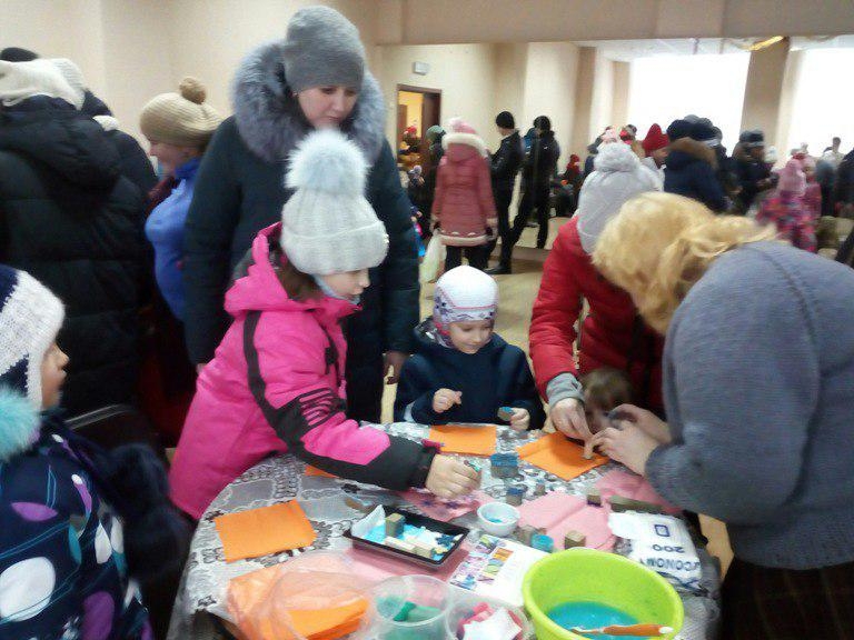 Но не только на улице можно играть в зимний денек. Зима — самое время порукодельничать. Кроме веселых игр на городском празднике была возможность поучаствовать в интересных мастер-классах. Одной из таких возможностей стал мастер-класс по набойке на ткани от Пришвинки.
