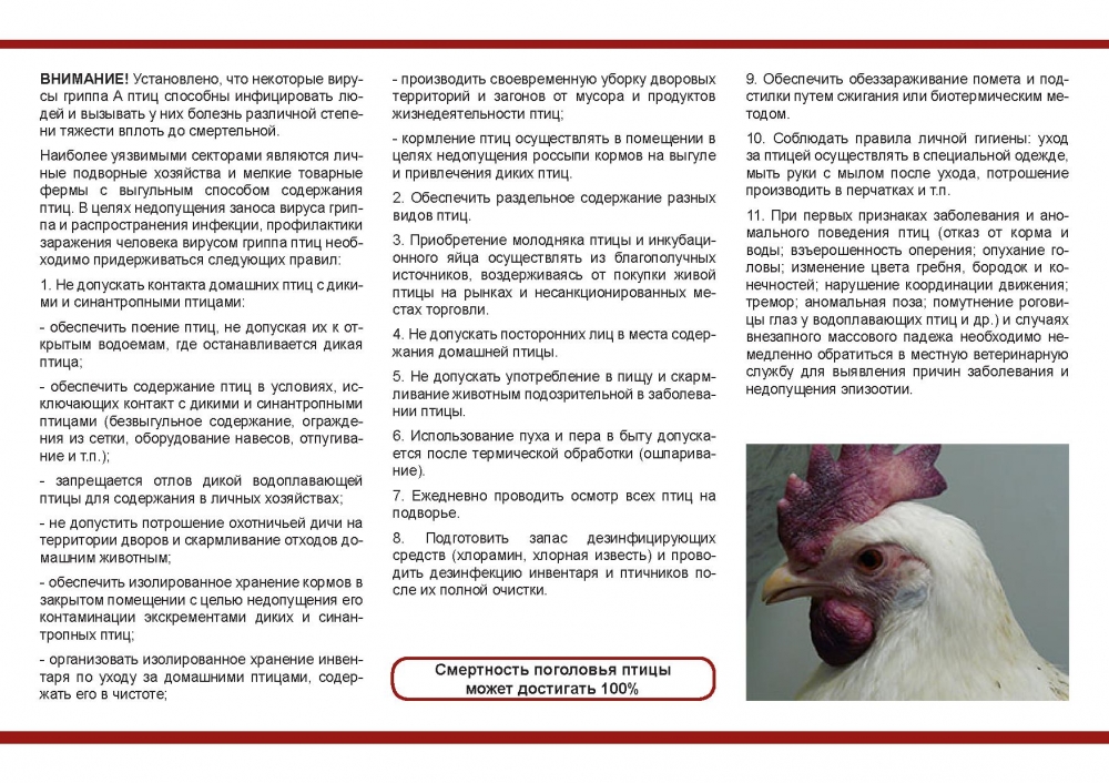 - при первых признаках заболевания у птицы немедленно обратиться в районную ветеринарную станцию по телефону (48535) 3-14-85.