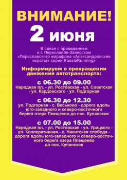 Уважаемые переславцы и гости города, в связи с проведением 17 июня соревнований этапов Кубка России и Кубка ФТР по триатлону, будут внесены изменения в график и в маршруты движения общественного транспорта, а также будет временно ограничено движение транспортных средств/ 14 Июня 2018 10:34