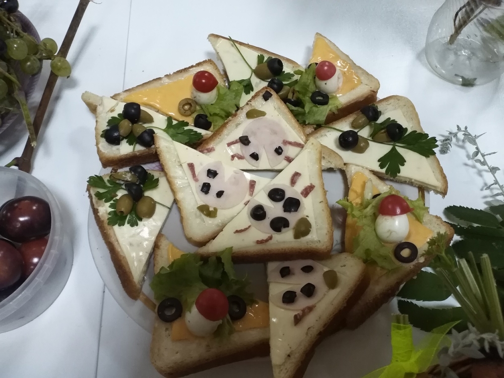 Затем участники с удовольствием представили свои творческие работы. Состоялась игра со зрителями: нужно было угадать какой плод представляет ведущая – ягоду, фрукт или овощ. На празднике каждый желающий мог продегустировать представленные блюда: салаты, блинчики с капустой, оладьи из кабачков, приготовленные из своих овощей и ягод. Участники и гости с удовольствием отведали угощения и высказывали свое мнение, делились рецептами.