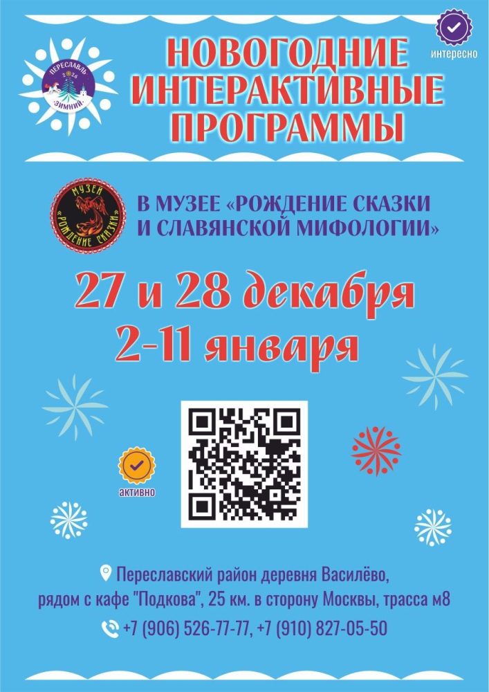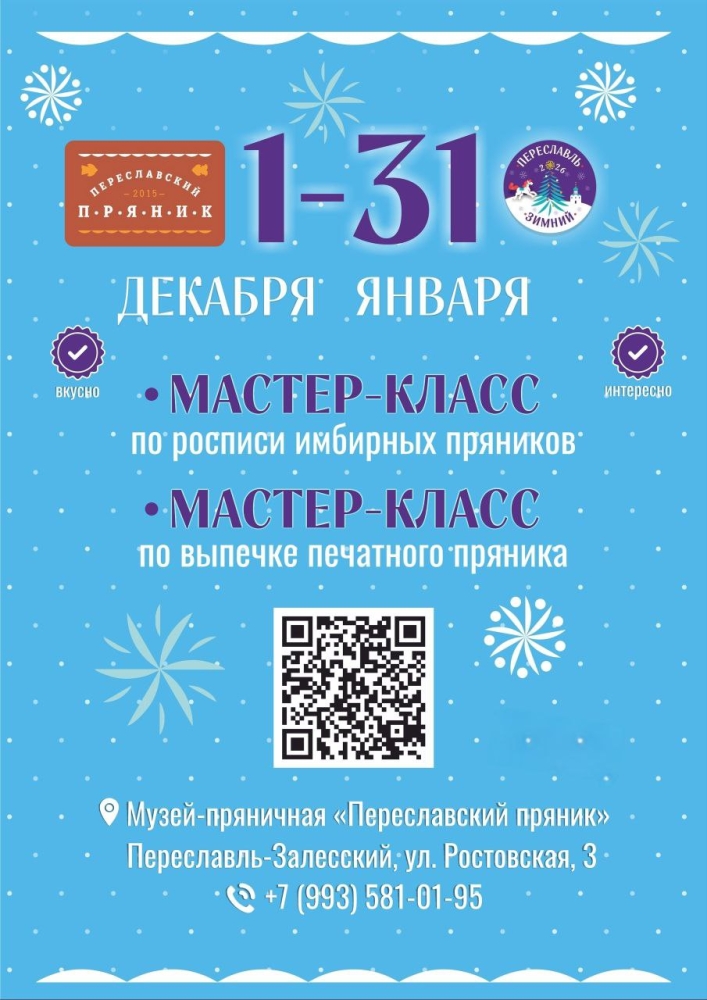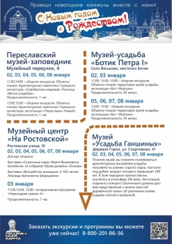 С 20 декабря и до первых весенних дней на Народной площади будет работать бесплатный открытый каток, здесь проходят веселые праздничные программы. До 10 января можно поучаствовать в квест-игре «Конь в мешке», а в многочисленных музеях округа – посетить выставки, мастер-классы и тематические новогодние мероприятия. 2 января в нашем муниципальном округе стартовал 21-й фестиваль воздухоплавания «Яблоки на снегу», на который приезжают гости со всей страны. Он продлится до 7 января, и при хорошей погоде желающие смогут подняться в небо на привязных воздушных шарах. А в праздник Рождества Христова свои двери гостеприимно распахнет Переславский музей-заповедник, подготовивший увлекательную программу для взрослых и ребят. Интересная рождественская программа будет показана 7 января и на Народной площади.