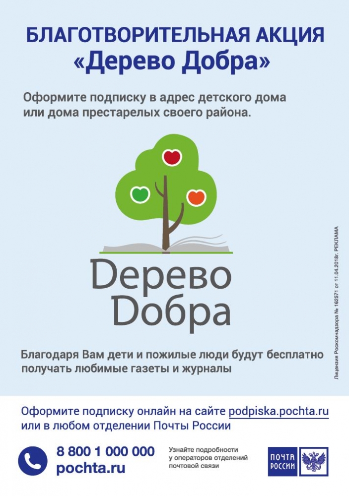 Благотворительную подписку можно оформить на научно-популярные и развлекательные газеты и журналы для воспитанников детских домов, приютов Ярославской области. Принять участие в акции «Дерево добра» можно онлайн на сайте Почты России или в отделениях почтовой связи.