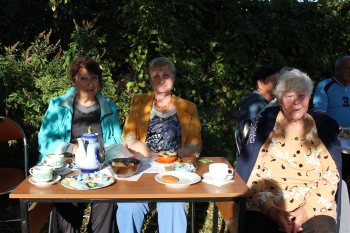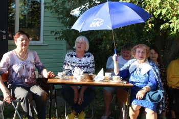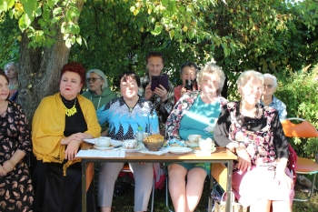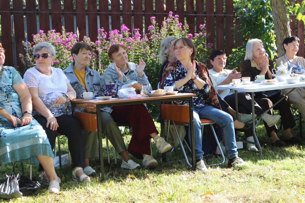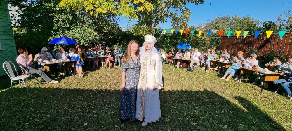 Расположившись, кто на солнышке, кто в тени деревьев, гости за чашкой чая, к которой прилагались вкусные конфеты и печенье, принялись отгадывать названия звучащих музыкальных фрагментов песен своей молодости. Вспоминали, какие праздники отмечаются в сентябре, оказалось, что самый значимый это – День памяти святого благоверного князя Александра Невского. А тут и супруга духовного покровителя Земли Переславской полоцкая княжна Александра Брячиславна, дочь князя Брячислава (ее роль исполнила сотрудник библиотеки Елена Шаренкова), в гости пожаловала и принялась озадачивать гостей вопросами по истории Залесья. Гости в грязь лицом не ударили: отвечали правильно и не задумываясь.