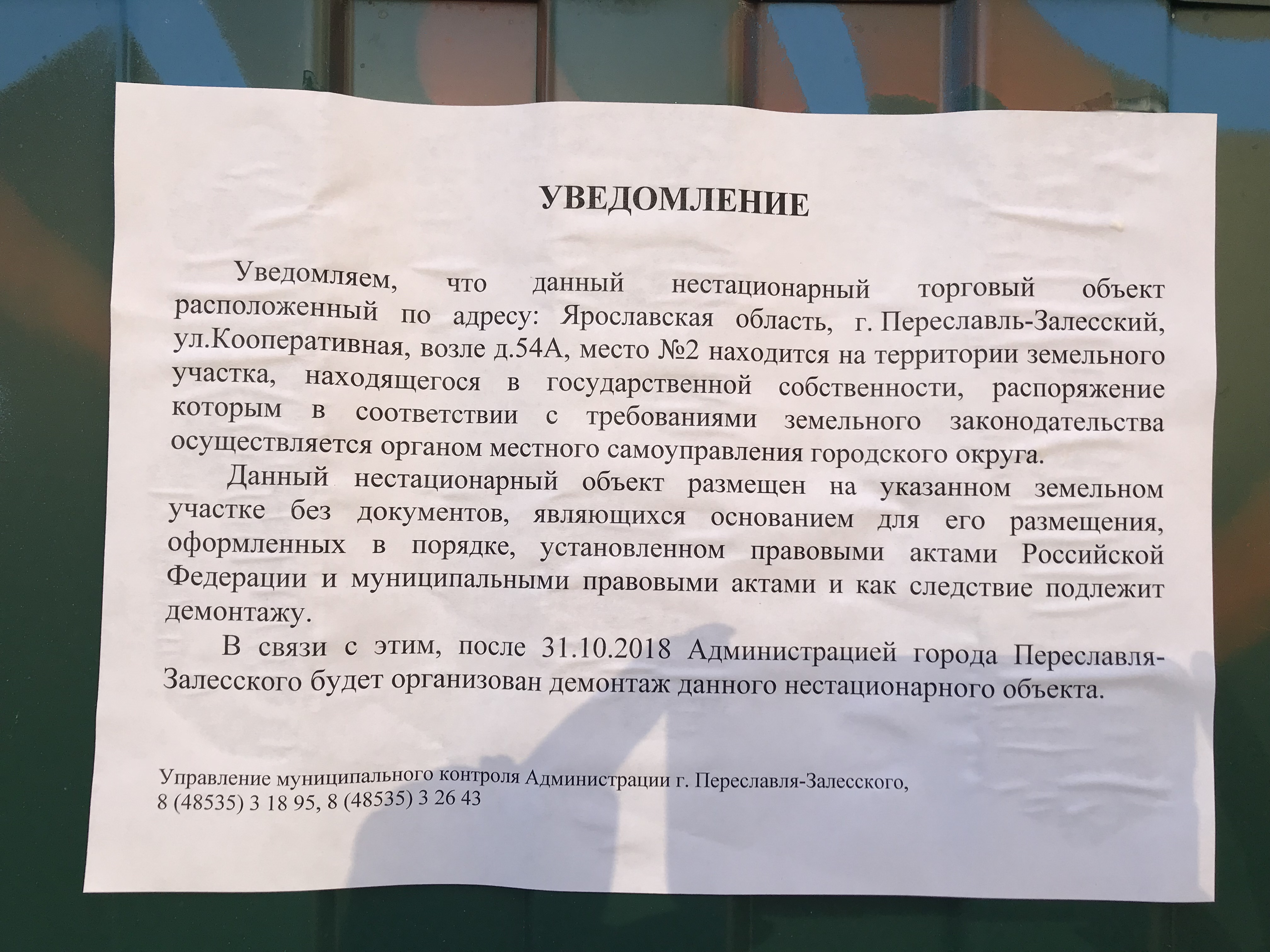 Предписание о демонтаже нестационарного объекта, расположенного по адресу: Ярославская область, г. Переславль-Залесский, ул. Кооперативная, возле д. 54А, (место №2)
