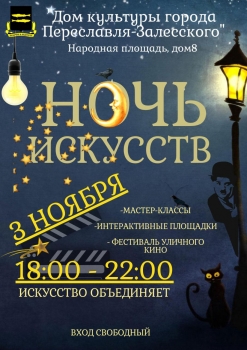 В рамках Дня народного единства и Всероссийской акции «Ночь искусств» 3 ноября в Доме культуры г. Переславля-Залесского на Народной площади пройдёт ВЕЧЕР ИСКУССТВ под девизом : «Культура в режиме НОН СТОП!».