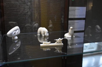 Виктория Геннадьевна пояснила, что экспозиция разделена на два зала – светлый, олицетворяющий собой тундру, и темный – представляющий пространство чума. В светлом зале выставлены вещи уличные, в темном – предметы, характеризующие домашнее пространство (бытовые, ритуальные вещи, фигурки духов).