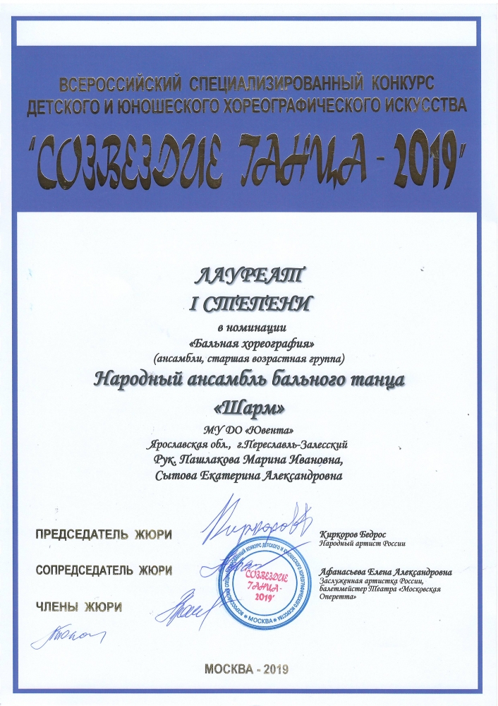 Ансамбль «Шарм» под руководством Марины Пашлаковой и Екатерины Сытовой получил диплом лауреата I степени в номинации «Бальная хореография», старшая возрастная группа.