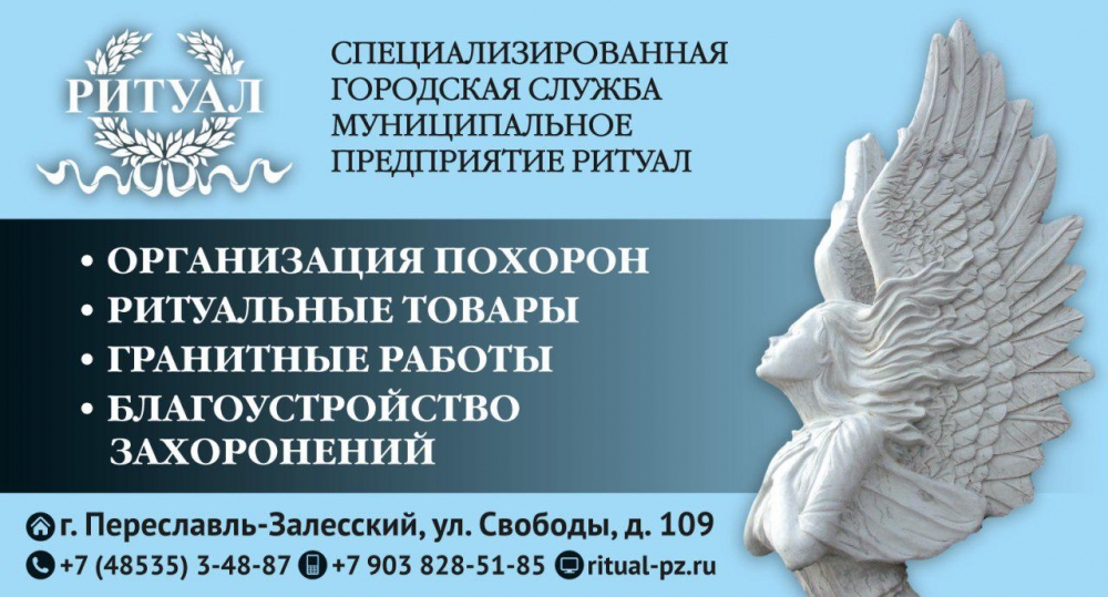 Обратиться в специализированную городскую службу ― муниципальное предприятие «Ритуал» можно круглосуточно по телефонам: 8-903-828-51-85, 3-48-87. Сайт: ritual-pz@mail.ru. Адрес: г.Переславль, ул.Свободы, д. 109 (в здании морга).