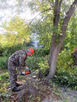 — Сегодня проводится санитарная обрезка растений, вырубаются и убираются сухие деревья и кустарники, — продолжила Ольга Николаевна. — И не только сухие. Мы вырубаем такие растения, которые, разрастаясь, заглушают другие декоративные деревья и кустарники. Кроме того, предоставив посадочный материал, мы даем рекомендации по уходу за ним.