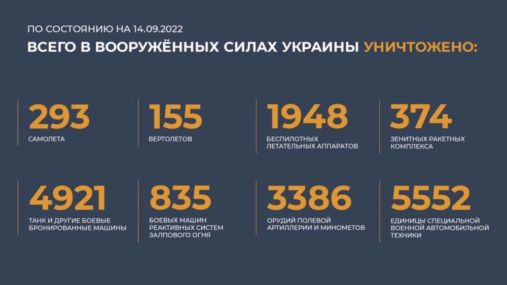 Сводка Минобороны России о ходе проведения специальной военной операции на территории Украины (по состоянию на 14 сентября 2022 г.)