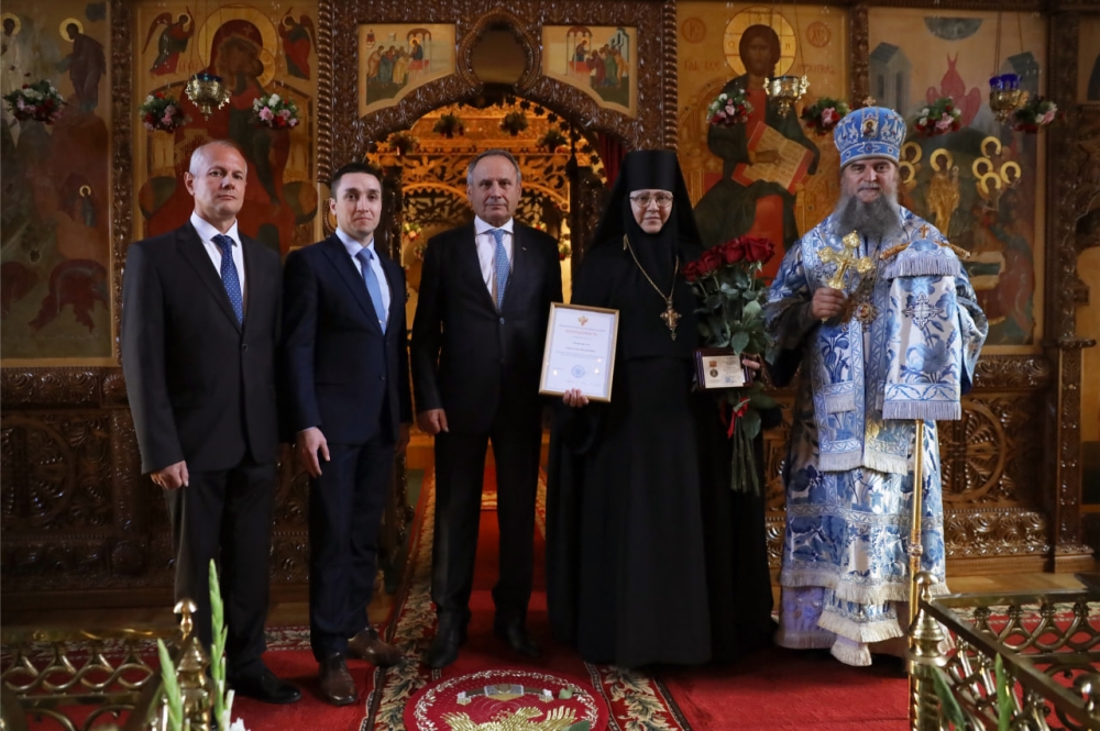 В торжественной обстановке Михаил Васильевич Боровицкий вручил Матушке игумении Еротииде Почетный знак «За вклад в развитие Ярославской области». Это высшая награда областной законодательной власти. Михаил Васильевич отметил высокие достижения настоятельницы. Труды матушки и сестер в сфере образования, культуры и благотворительности приносят большие плоды и способствуют развитию региона: