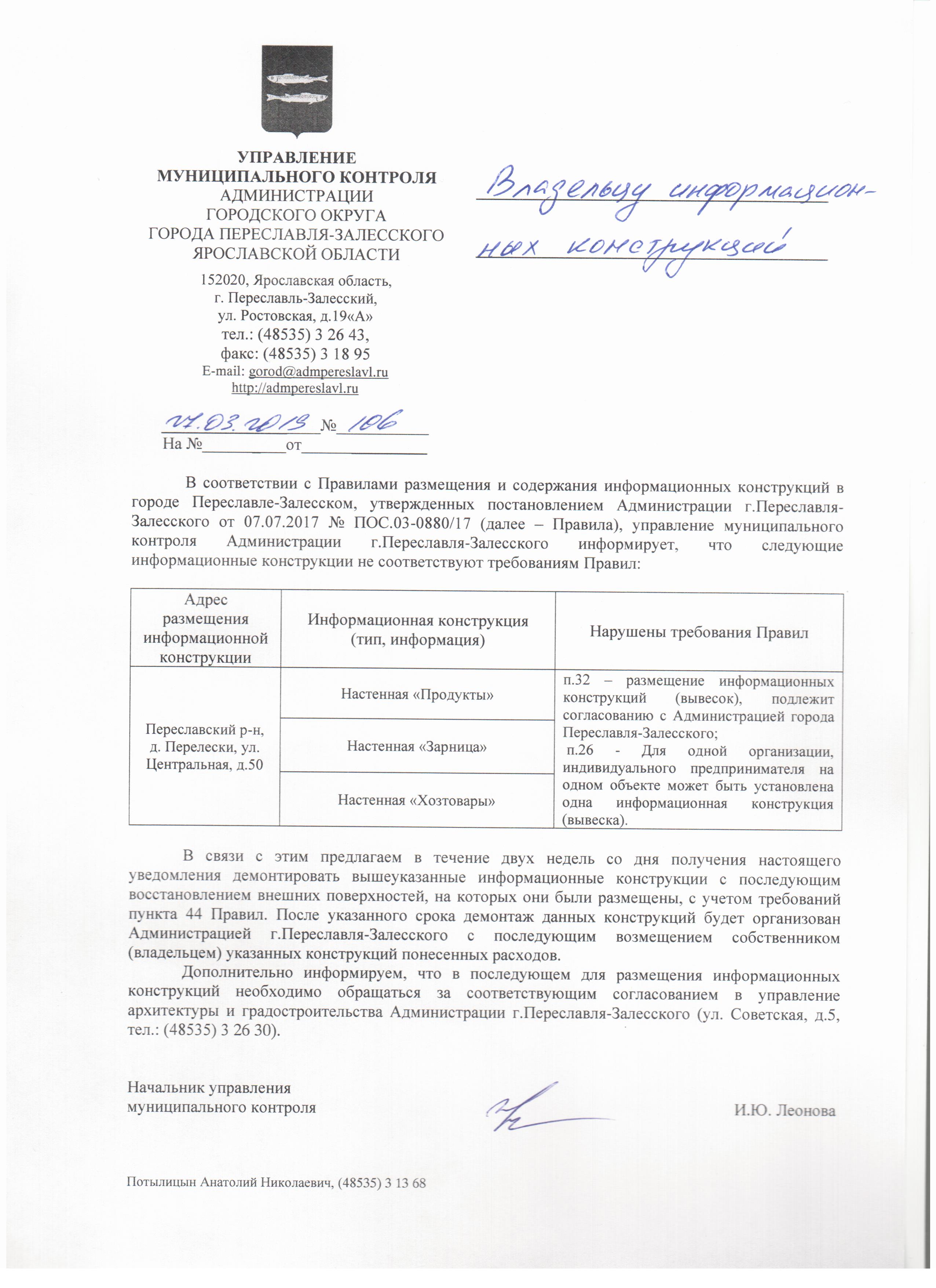 Уведомления о демонтаже информационных конструкций, расположенных по адресу: Переславский р-н, д. Перелески