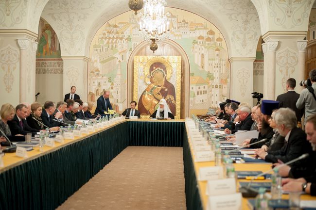За круглым столом собрались представители государственных органов власти, Русской православной церкви, общественных организаций и фондов.