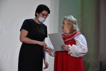 Ирина Строкинова вручила благодарность Министра культуры Российской Федерации «За большой вклад в развитие культуры и многолетнюю плодотворную работу» Любови Дозор, ведущему библиотекарю городской библиотеки имени Александра Невского.