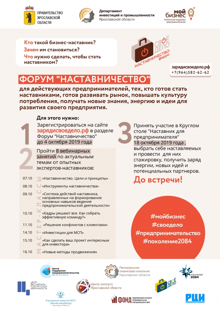 Осенью в Ярославской области пройдёт форум «Наставничество». Жители региона, планирующие открыть свой бизнес, смогут пройти обучение основам предпринимательской грамотности и стажировку в компаниях малого бизнеса под руководством наставников.