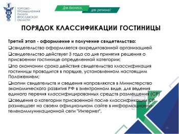 Вице-президент ЯрТПП Александр Федоров отметил, что одна из целей встречи — информирование о мерах государственной поддержки бизнеса федерального и регионального уровней. Начальник отдела Фонда поддержки малого и среднего предпринимательства Юлия Петрова рассказала о микрозаймах фонда на льготных условиях. Заместитель директора департамента ЯрТПП Марина Клюшкина подготовила доклад по классификации гостиниц и иных средств размещения.