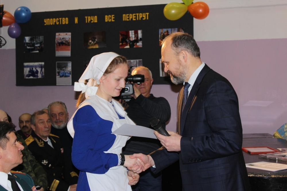 Валерий Астраханцев вручил почётную грамоту Фонда Андрея Первозванного иеромонаху Петру за добросовестный многолетний труд по патриотическому воспитанию молодёжи, почётные грамоты главы городского округа — начальнику Кадетского Корпуса Илье Василенко и заместителю начальника Ярославу Юрчаку, а также благодарственные письма кадетам за первое место в финале Всероссийской военно-патриотической игры «Победа-2019».